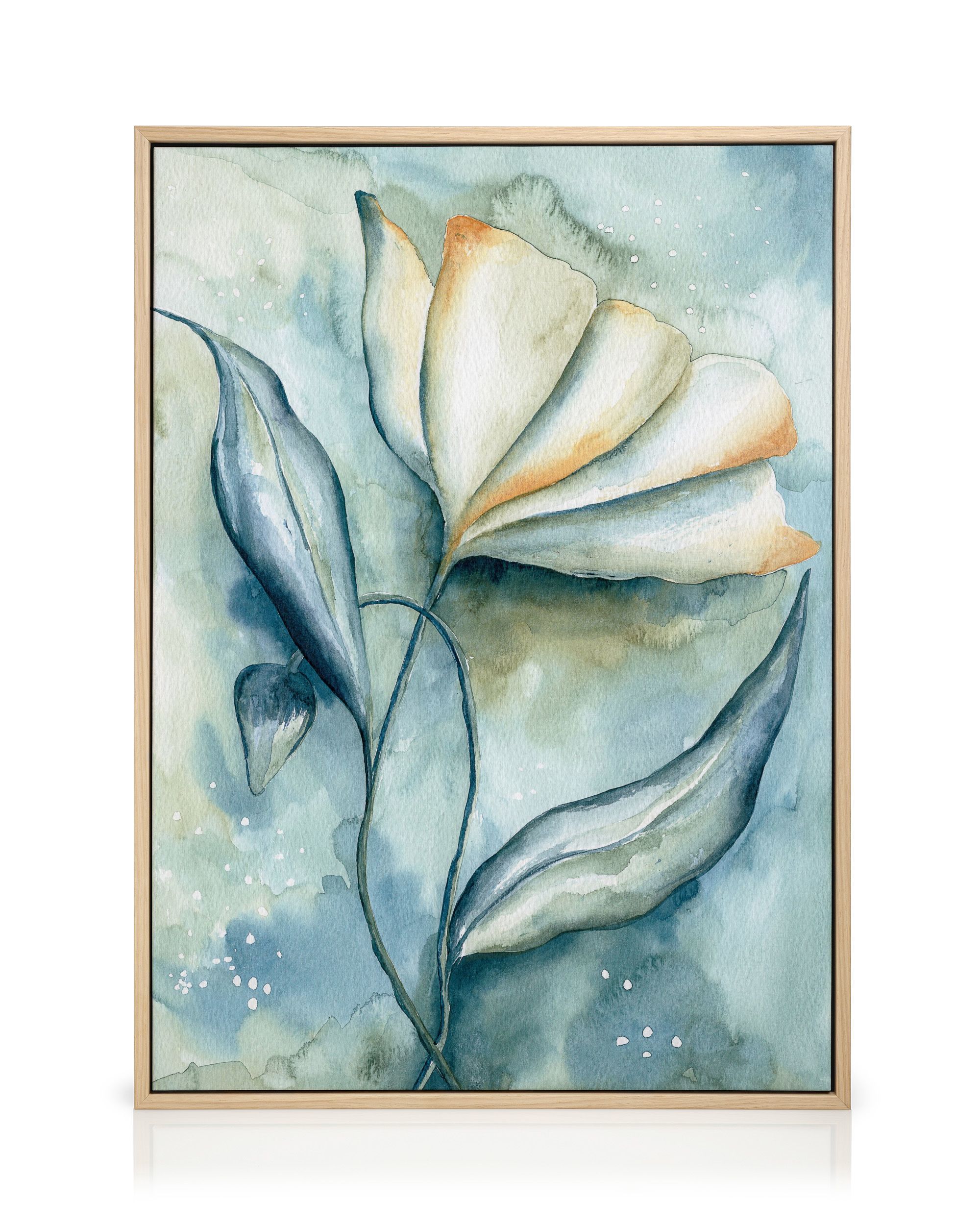Gyönyörű akvarell vászon kék virággal türkiz tónusokban. Tökéletes fali dekoráció az otthonához.