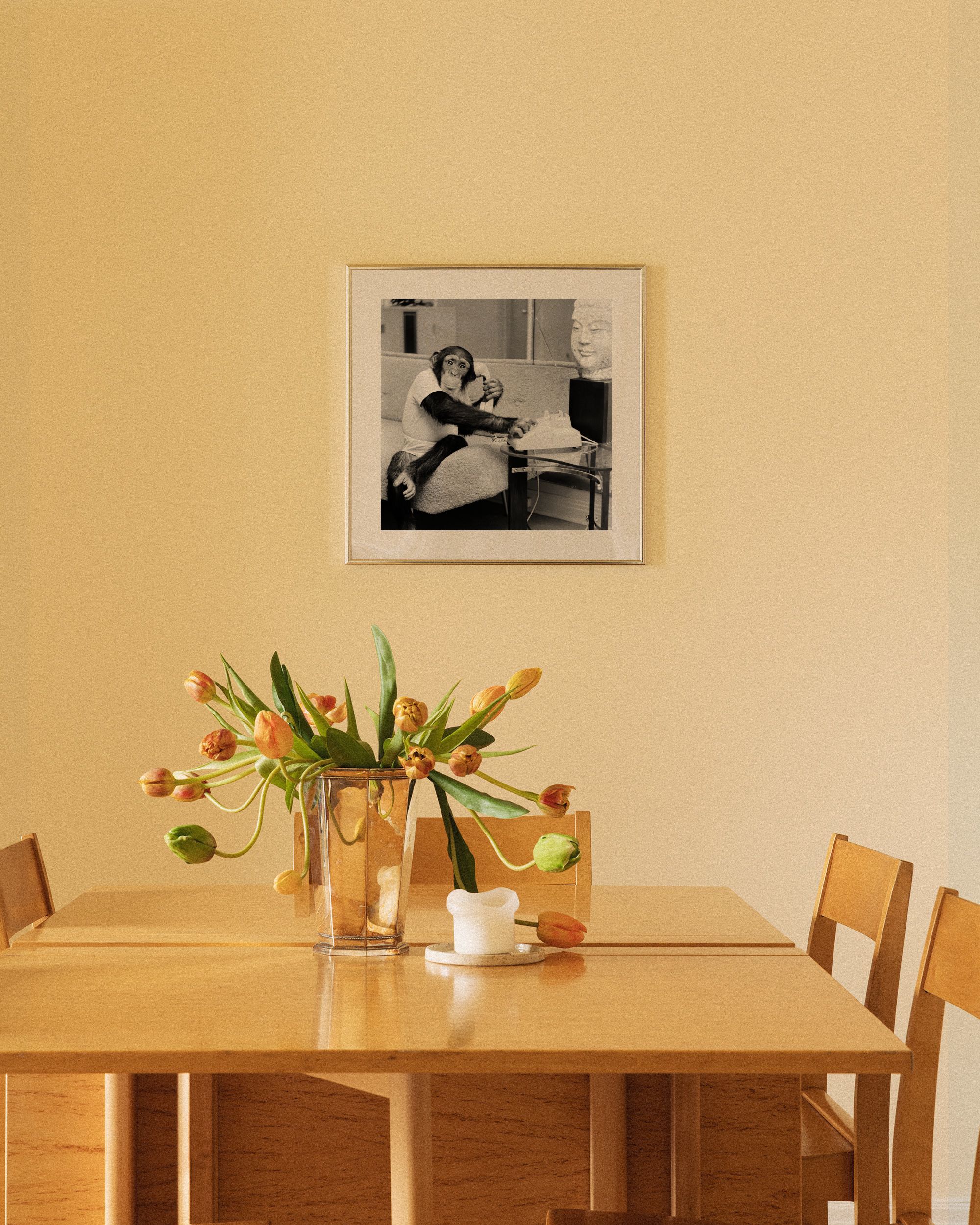 Egy csimpánz telefonál fehér ingben ezen a fekete-fehér poszteren. Vicces fali kép, ami mosolyt csal az arcodra.