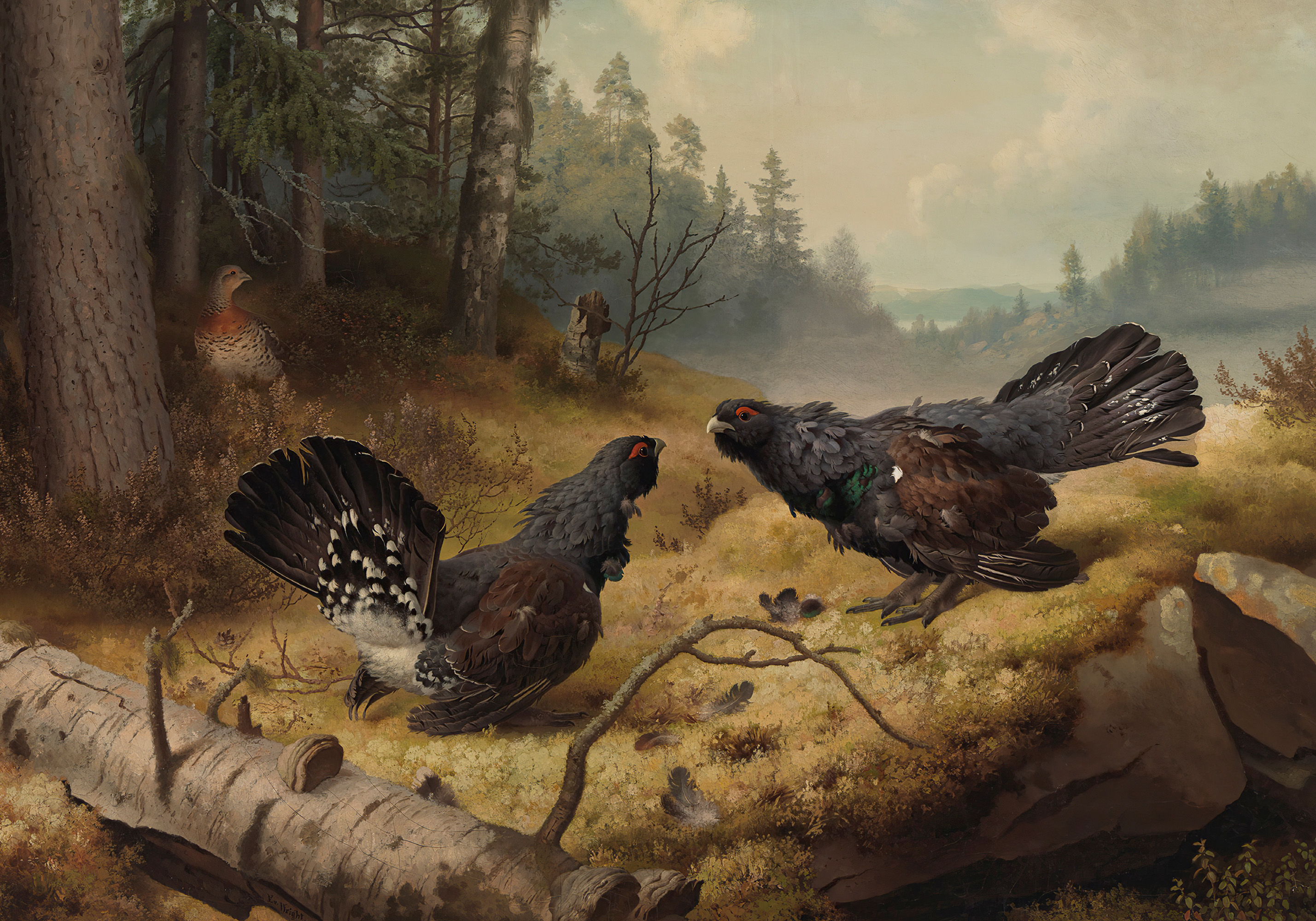 13 601,25 Ft-tólEgy poszter, amely két egymással szembenéző siketfajdot ábrázol mohás talajon. Az egyik madár szárnyait drámai pózban kitárja, sötét tollazattal és vörös jelölésekkel. Tökéletes fali dekoráció a természet szerelmeseinek.