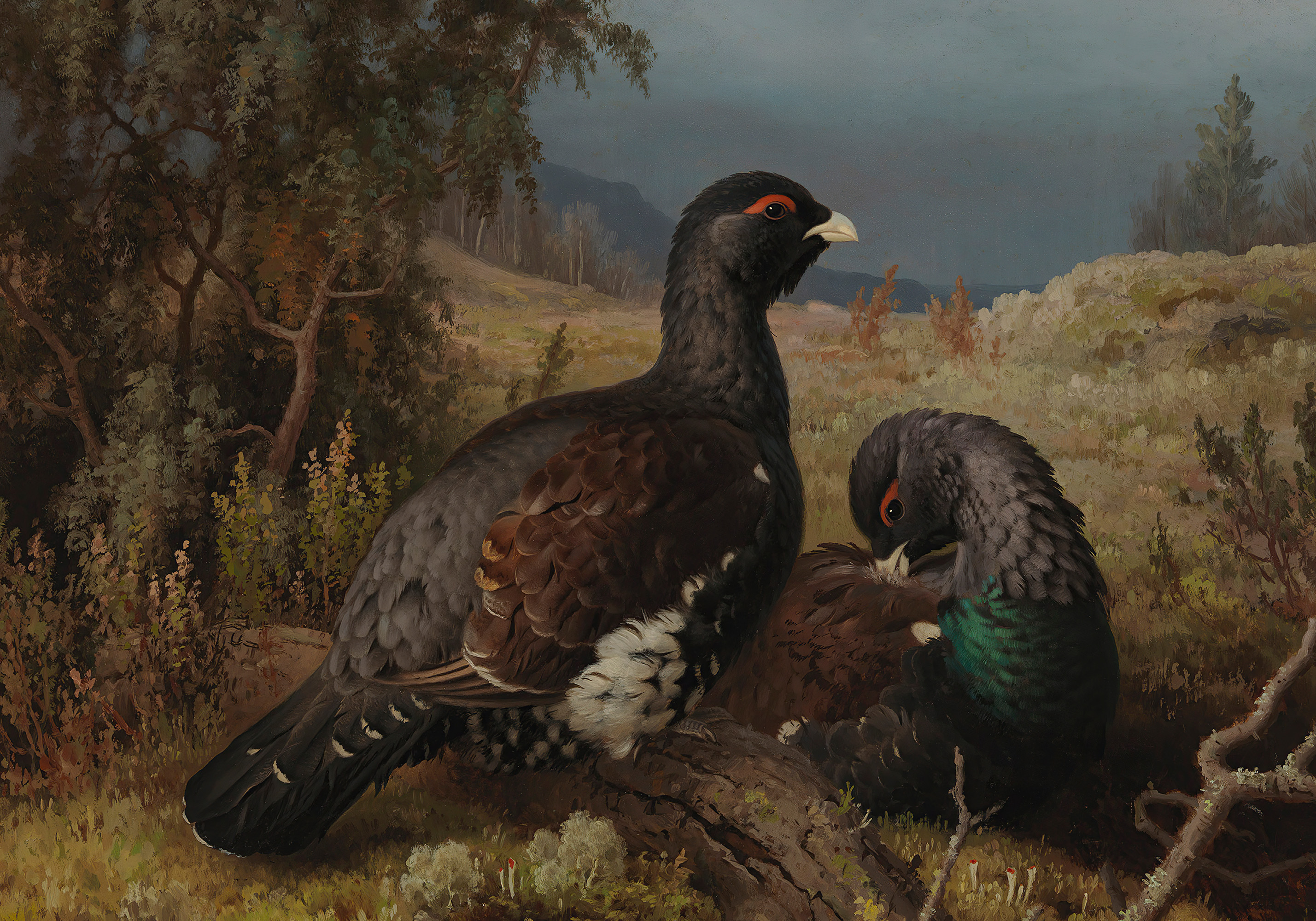 Gyönyörű poszter, amely két siketfajd madarat ábrázol természetes környezetben, részletesen kidolgozott tollazattal és zöld lombozattal a háttérben.
