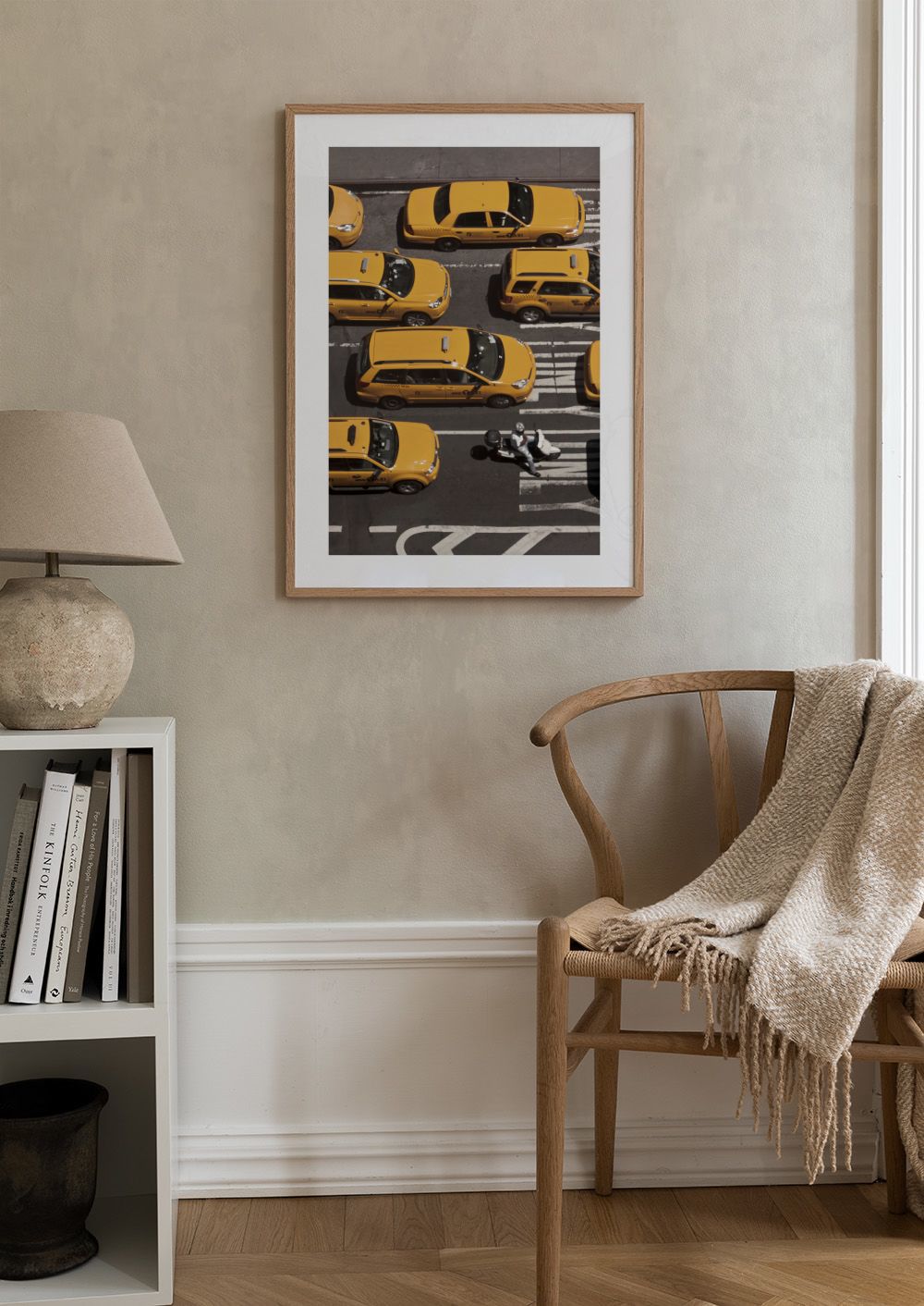 Sárga taxik sorakoznak a Broadway-n, madártávlatból nézve. Egy roller is látható az úton, fehér csíkokkal jelölve. Élénk városi forgalom.